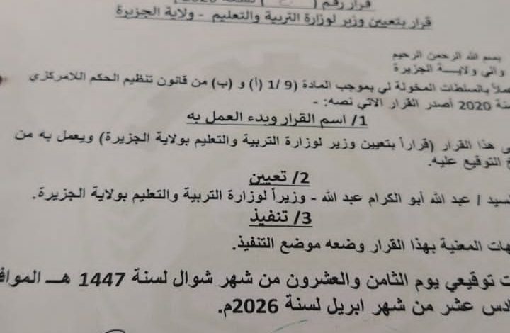 أصدر والي ولاية الجزيرة أ. الطاهر إبراهيم الخير القرار رقم (20)لسنة 2026م القاضي بتعيين أ. عبدالله ابوالكرام عبدالله وزيرا لوزارة التربية والتعليم في ولاية الجزيرة.