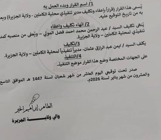 أصدر والي ولاية الجزيرة أ. الطاهر إبراهيم الخير القرار رقم (3)لسنة 2026م يقضى بإعفاء وتكليف مدير تنفيذي لمحلية الكاملين في ولاية الجزيرة (وسط السودان) وجاء في القرار.