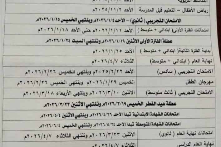 وأكد مدير عام وزارة التربية والتعليم، الأستاذ عبد الله أبو الكرام عبد الله، أن امتحان الشهادة الابتدائية سيبدأ يوم الأحد 26 أبريل 2026م، ويستمر حتى الاثنين( 4) مايو 2026م، بينما سيُجرى امتحان الشهادة المتوسطة يوم الأحد( 24) مايو 2026م وينتهي يوم الخميس (4) يونيو 2026م