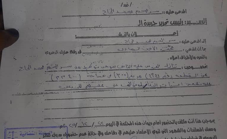 بخصوص تنازل المدعى عليه الثاني بموجب توكيل من سر الختم محمد الحاج عن القطعة رقم (494) مربع (300) في مساحة (400م م) عليه نلتمس اثبات التنازل من المدعي عليهم للمدعي بموجب هذا انت مكلف بالحضور امام ديوان هذه المحكمة في يوم 2025/12/22ومعك المستندات والشهود التي تنوي الاعتماد عليهم في دفاعك وفي حالة عدم حضورك سوف ننظر الدعوى في غيابك ويفصل فيها.
