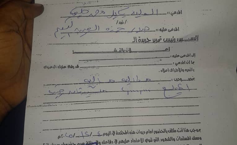 بخصوص مطالبة مالية المبلغ 2.000.000مليونان جنيه بموجب هذا انت مكلف بالحضور امام ديوان هذه المحكمة في اليوم 4/12/2025