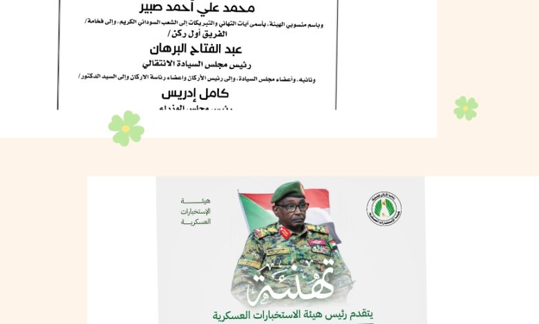 يتقدم السيد رئيس هيئة الاستخبارات العسكرية سعادة الفريق ركن محمد علي أحمد صبير، وباسم جميع منسوبي الهيئة، بأصدق آيات التهاني والتبريكات إلى الشعب السوداني الكريم، وإلى فخامة الفريق أول ركن عبد الفتاح البرهان رئيس مجلس السيادة الانتقالي، ونائبه، وأعضاء مجلس السيادة، وإلى دولة رئيس مجلس الوزراء الدكتور كامل إدريس، وإلى القوات المسلحة السودانية الباسلة، وإلى السيد رئيس هيئة الأركان وأعضاء رئاسة الأركان، وذلك بمناسبة الذكرى السبعين لاستقلال السودان المجيد.