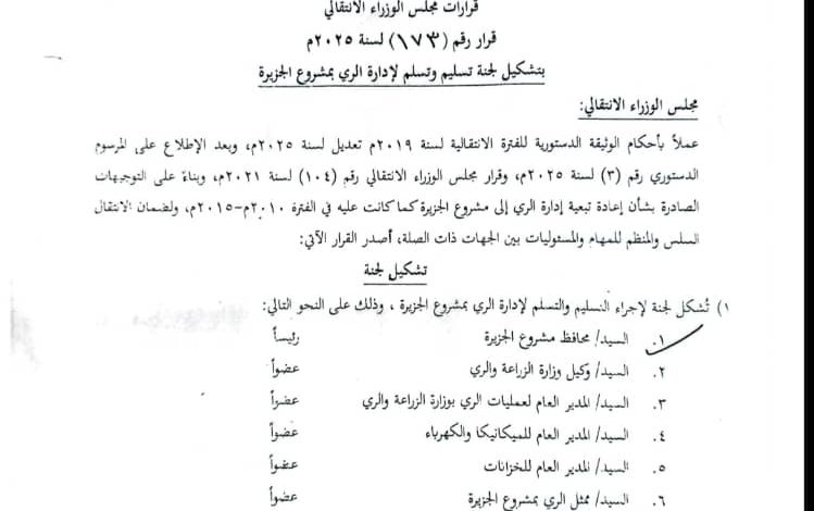 اصدر رئيس مجلس الوزراء الانتقالي د. كامل ادريس الطيب القرار رقم (١٧٣)لسنة ٢٠٢٥م القاضي بتشكيل لجنة تسليم وتسلم لادارة الري بمشروع الجزيرة، حيث تحصلت (بعانخي بريس) علي القرار الذي جاء فيه، بناءا علي المرسوم الدستوري رقم (٣) لسنة ٢٠٢٥م وقرار مجلس الوزراء رقم (١٠٤) لسنة ٢٠٢١م وبناءا علي التوجيهات الصادرة بشأن اعادة تبعية ادارة الري الي مشروع الجزيرة الي ما كانت عليه 2015/2010م ولضمان الانتقال السلس والمنظم للمهام والمسئوليات بين الجهات ذات الصلة اصدر القرار بشكيل لجنة برئاسة محافظ مشروع الجزيرة وتسعة اعضاء، علي ان تكون المهام والاختصاصات، اجراء التسليم والتسلم وحصر جميع الاصول والممتلكات والمعدات والسجلات الفنية لشبكة الري الصغري والكبري، واتخاذ الاجراءات الخاصة بانتداب المهندسين والعاملين من وزارة الزراعة والري الي ادارة الري بالمشروع بكامل مخصصات الفصل الاول.