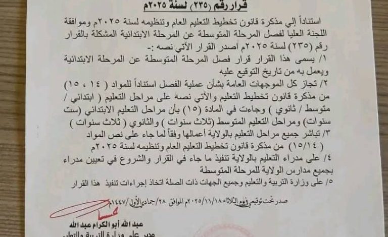 اصدر المدير العام القرار رقم (235) لسنة 2025 القاضي بفصل المرحلة الابتدائية عن المرحلة المتوسطة، استناداً إلى مذكرة قانون تخطيط التعليم العام وتنظيمه لسنة 2025م وتوصيات اللجنة الفنية لمعالجة قضايا التعليم بالمرحلة المتوسطة.