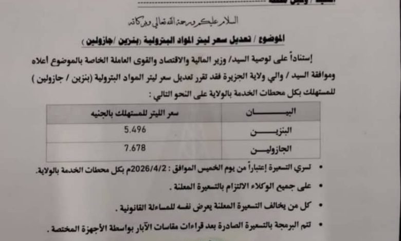 علي أن تسري التسعيرة اعتبارا من يوم الثلاثاء 2026/4/2 بكل محطات الخدمة بالولاية وعلى جميع الوكلاء الالتزام بالتسعيرة المعلنة.