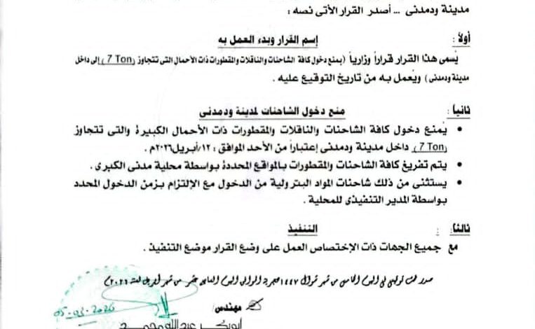 اصدرت حكومة ولاية الجزيرة ، اليوم قرارا بمنع كافة الشاحنات والمقطورات والناقلات ذات الاحمال التي تتجاوز ( ٧ طن) للدخول داخل مدينة ودمدني ، وذلك اعتبارا من الاحد المقبل الموافق ١٢ ابريل ٢٠٢٦م ، علي ان يتم تفريغ الحمولة بمواقع تحددها محلية ودمدني الكبري ، واستثني القرار شاحنات المواد البترولية مع الالتزام بزمن الدخول والذي يحدده المدير التنفيذي للمحلية .