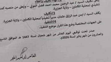 مدني: عبدالوهاب السنجك أصدر والي ولاية الجزيرة أ. الطاهر إبراهيم الخير القرار رقم (3)لسنة 2026م يقضى بإعفاء وتكليف…